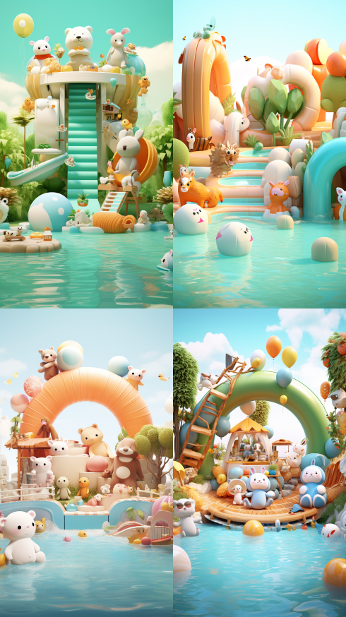 Midjourney Bot 更新时间:2023-08-31 14:49Home decoration festival C4D scene, a group of animals are celebrating wildly, there is a swimming pool and a slide around. --ar 9:16 --v 5.2 --style raw