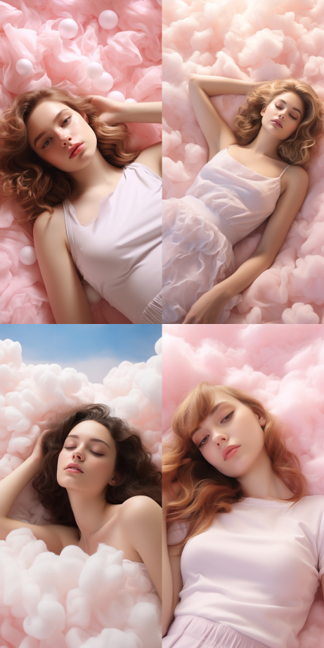 Midjourney Bot 更新时间:2023-08-31 14:45An 18 year old beautiful girl lies on pink clouds, soft and comfortable, with artistic details, realism, natural rendering style, organic flow form, light white and light pink cloud sky, dreamy style, and very high-end fashion --ar 1:2 --style raw --v 5.2