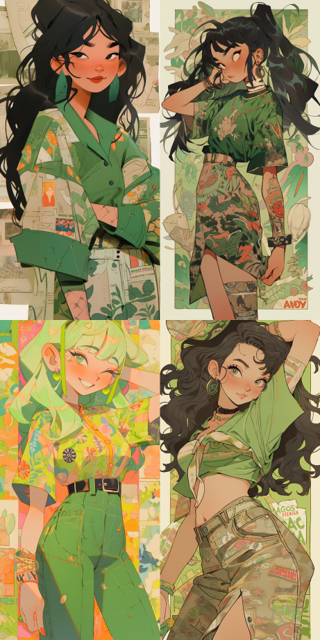 Midjourney Bot 更新时间:2023-08-31 14:44A carton illustration of a lady in a green shirt over art by mr becca doodlefly, full body, in the style of grunge beauty, sandara tang, mixed patterns, text and emoji installations, close up, charging character illustrations, folkloric --s 180 --ar 1:2 --style expressive --niji 5