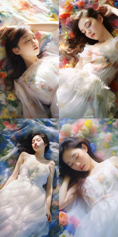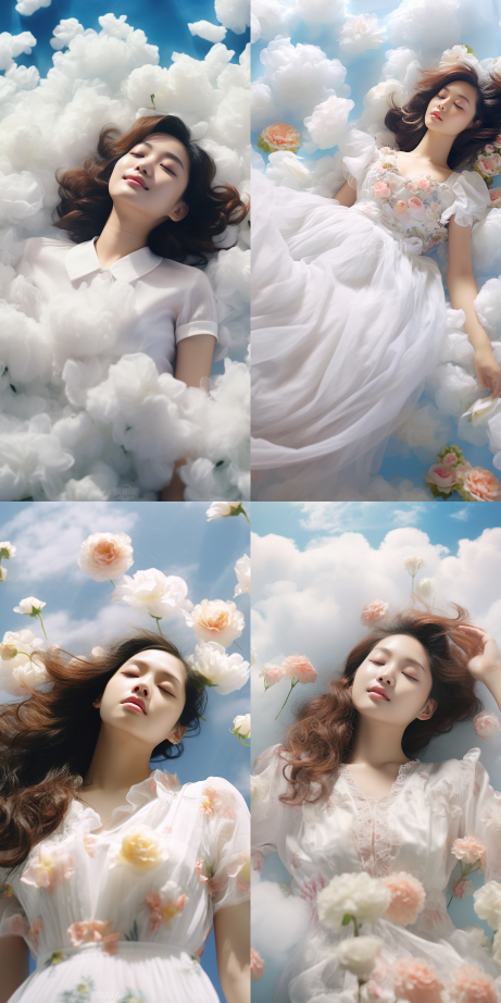 Midjourney Bot 更新时间:2023-08-31 14:50An 18 year old Chinese girl, lying on a fairy tale like cloud, in the sky, with her fair skin, pure white dress and softness, Monet's garden and colorful defocus, bright sunshine and peaceful scenes --ar 1:2 --style raw --v 5.2