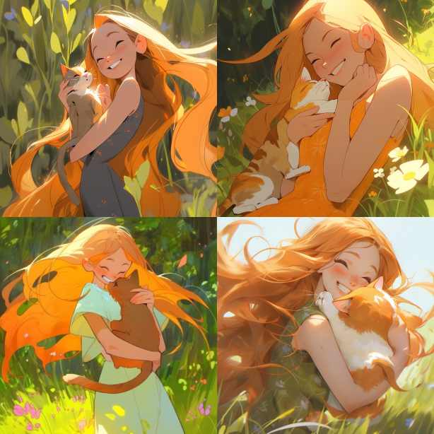 Midjourney Bot 更新时间:2023-08-31 14:56On a sunny afternoon, a girl with long hair stood on the grass in the garden. Her slender golden hair fluttered in the wind, giving people a feeling of freedom and tenderness. She gently hugged an orange cat, its orange spots dotted on its fur like a smile --ar 1:1 --style expressive --niji 5