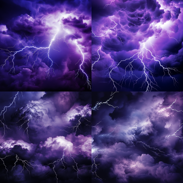 Midjourney Bot 更新时间:2023-08-31 14:53Lightning, lots of clouds, black-purple background. --ar 1:1 --v 5.2 --style raw