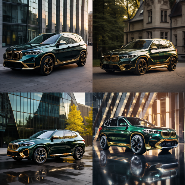 Midjourney Bot 更新时间:2023-08-31 14:44Masterpiece, high quality, 8k, 2020 BMW X1, dark green with gold trim car wrap, parked on the roadside, Ray Tracing Reflections. --ar 1:1 --style raw --v 5.2