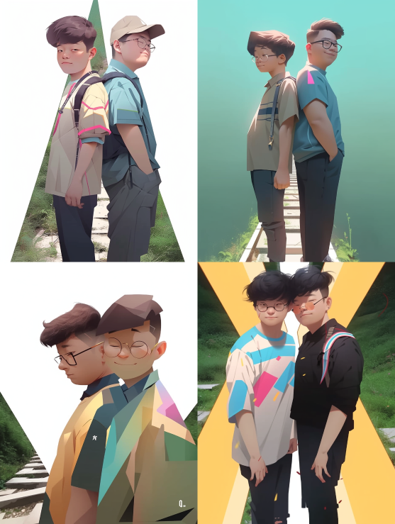 Midjourney Bot 更新时间:2023-08-31 14:45Flat style, flat coating, geometric shapes, two boys,Golden Ratio composition,vanishing point,Full body,panorama,Headshot,waist shot,Joey Chou --ar 3:4 --style expressive --niji 5