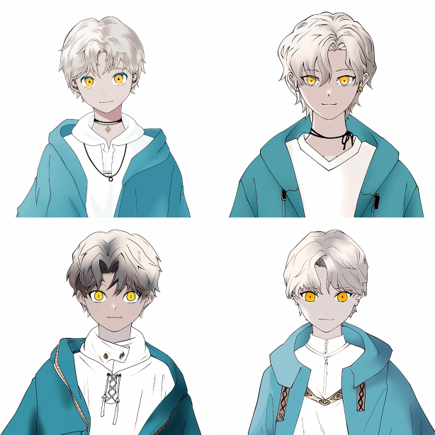 Midjourney Bot 更新时间:2023-08-31 14:49White short haired rock boy with golden pupils, white shirt base, blue hooded sweater half hanging over his shoulders,Takeshi Obata::1000 --s 0 --iw 2 --ar 1:1 --niji 5
