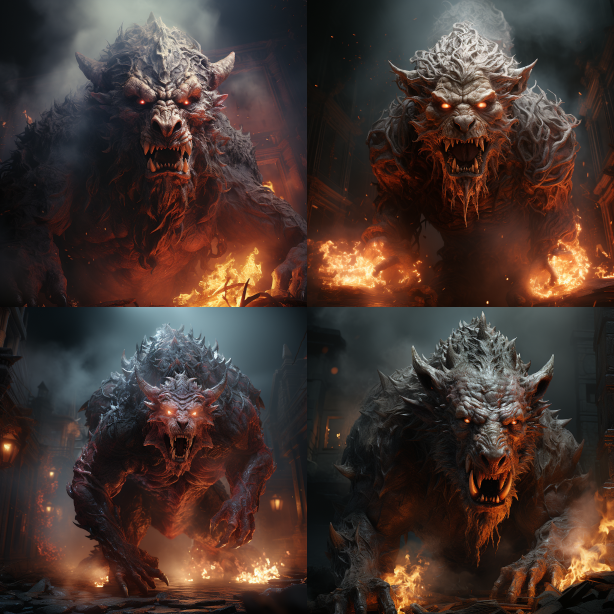 Midjourney Bot 更新时间:2023-08-31 14:273D texture, CG image quality, a monster with a pig's head and a human body. The head is that of a pig, while the body is that of a human. Its fangs protrude, and its body is three stories tall, surrounded by red smoke. --ar 1:1 --v 5.2 --style raw --s 750