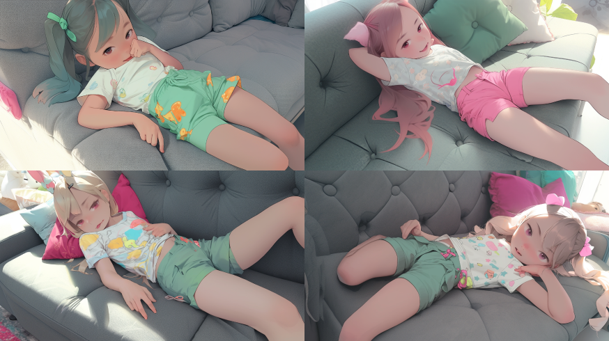 Midjourney Bot 更新时间:2023-08-31 14:27A happy little girl lying on the sofa --ar 16:9 --style expressive --niji 5