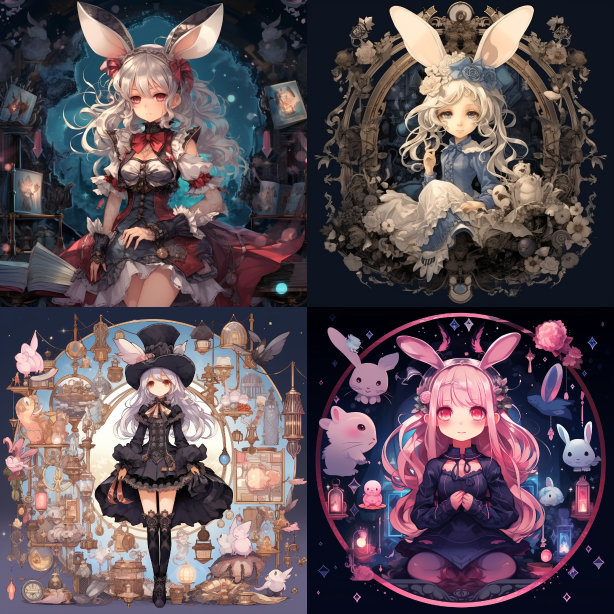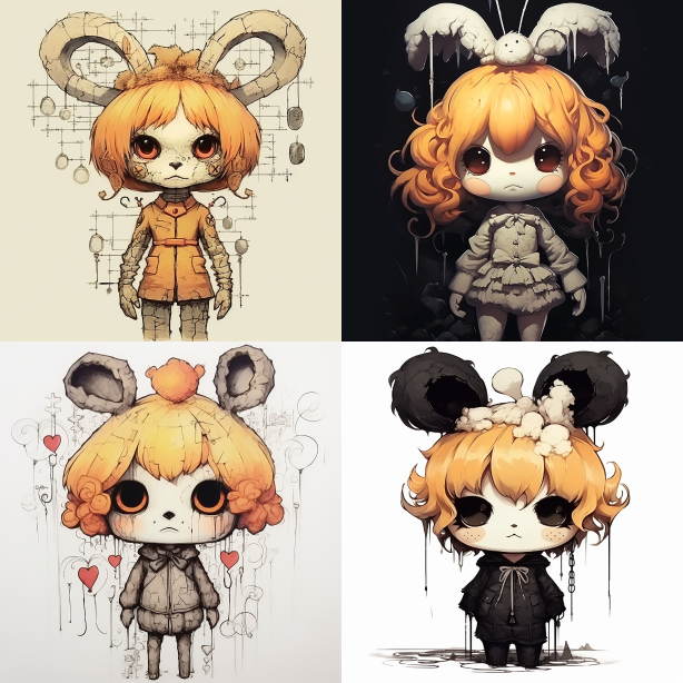 Midjourney Bot 更新时间:2023-08-31 14:302D, rabbit losing trust, rabbit princess, head accounting for 50%, body covered with stitches and patches, incomplete soul, dessert combination, dark fairy tale, Tim Burton style --s 216 --ar 1:1 --style raw --v 5.2