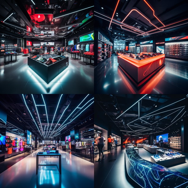 Midjourney Bot 更新时间:2023-08-31 14:22A Huge high tech sport store made of Simple high technology, walks modern nike store in the form shopping mall, interior design 8k, wide angle lens, Bright picture --ar 1:1 --style raw --v 5.2