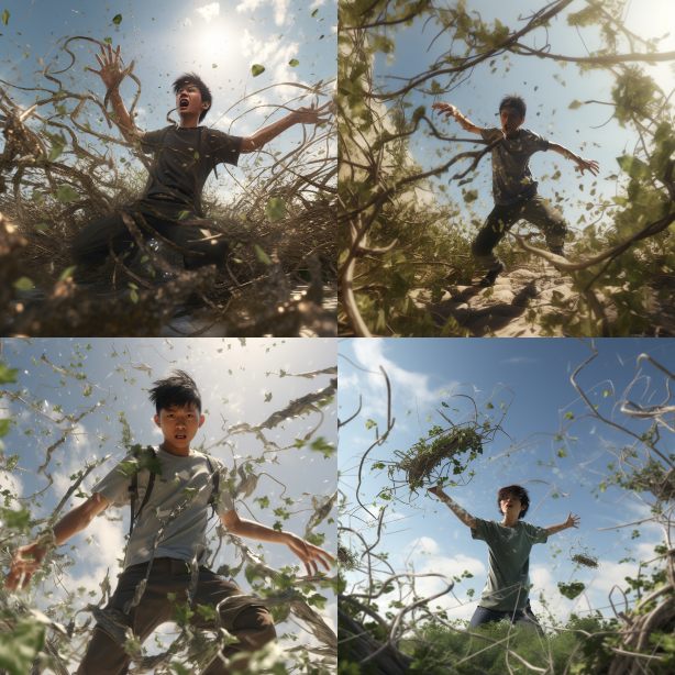 Midjourney Bot 更新时间:2023-08-31 14:203D texture, CG image quality, a Chinese-American teenager, his hands turned into two huge vines, smashing the ground. --ar 1:1 --v 5.2 --style raw
