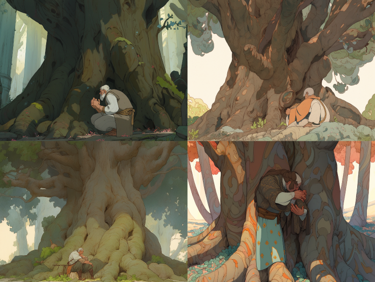Midjourney Bot 更新时间:2023-08-31 14:27A middle-aged man knelt in front of a huge and dense tree, his hands clasped together and prayed earnestly. The middle-aged man was filled with fruits and some pastries in front of him. The ancient tree was very large, exquisite, and dense. Texture. --ar 4:3 --style expressive --niji 5