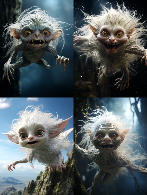 Midjourney Bot 更新时间:2023-08-31 13:573D texture, CG image quality, a creature resembling Gollum from The Lord of the Rings, with long white hair growing on its head, floating in mid-air. --ar 3:4 --v 5.2 --style raw --s 250