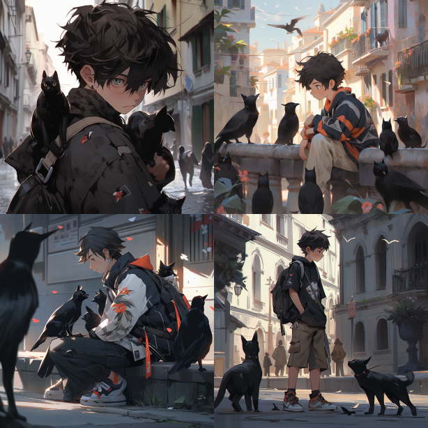 Midjourney Bot 更新时间:2023-08-31 13:58A boy with bloom short hair and a crow with three black cats walking on the streets of a small Swiss town, any wallpaper, in the style of super realistic town, western beauty, soft brushstroke realism, flat yet expressive, realistic coatings, strong financial expression, soft - edged,high resolution --s 400 --ar 1:1 --niji 5