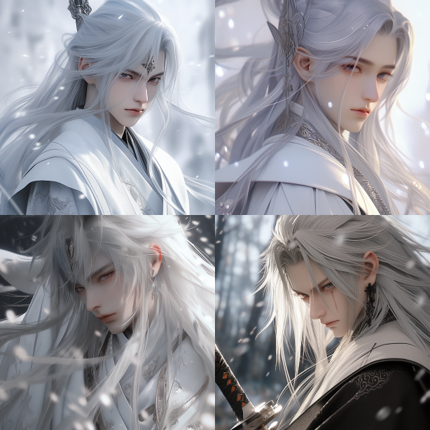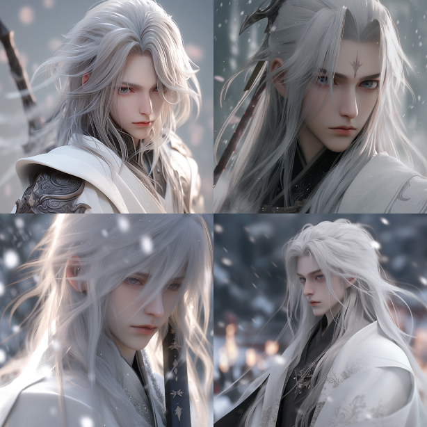 Midjourney Bot 更新时间:2023-08-31 13:58Chinese style, male, Hanfu, handsome, cool, carrying a sword behind him, silver gray long hair, facing the audience, front, face close-up, exquisite facial features, exquisite face, light white and light silver styles, simple gray background, classic, surrealist, carefully designed, 3D, c4d, Hyperdetail, animated lighting, defocus, perfect details, FHD, 4K, 8K, best picture quality, ultra clear, --s 110 --c 2 --ar 1:1 --niji 5