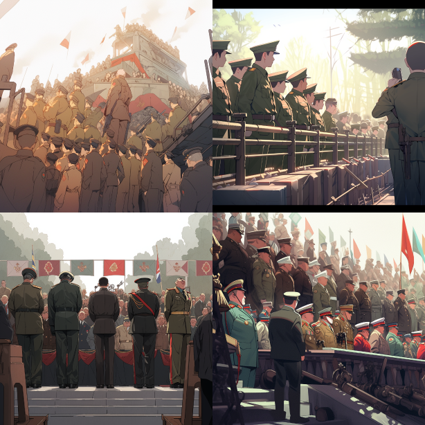 Midjourney Bot 更新时间:2023-08-31 14:02Senior officers stood on the podium, watching as different branches of the army stood densely packed below --ar 1:1 --niji 5