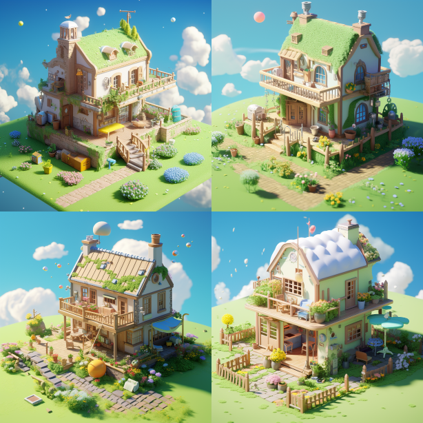 Midjourney Bot 更新时间:2023-08-31 13:55On a grassland, under the blue sky and white clouds, there is a small house that opens up like a castle. Inside, it feels like home with some household appliances. The house also has a small courtyard, and there are some decorative fences on the lights. The surroundings are filled with plants. --ar 1:1 --style raw --v 5.2 --s 250
