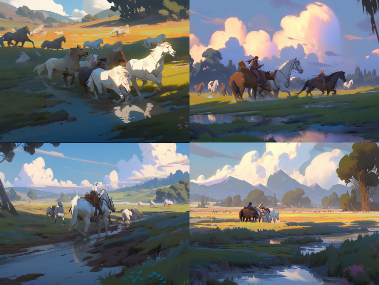Midjourney Bot 更新时间:2023-08-31 13:53Grassland, with a river, boundless, with snowy mountains in the distance, a group of horses running, sunset, romantic style, and Buddha's light --ar 4:3 --style expressive --niji 5 --s 250