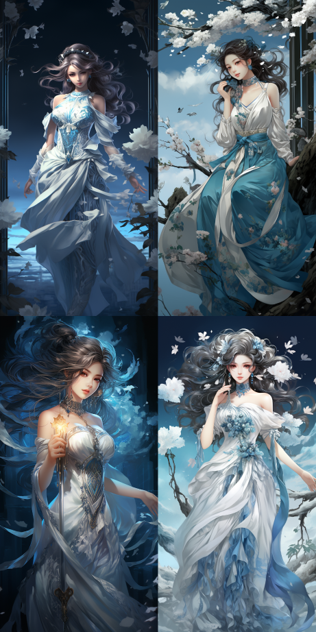 Midjourney Bot 更新时间:2023-08-31 14:04Chinese anime characters, light silver and light blue styles, beautiful women, night heart, exaggerated features, white tones, full body, anime style, Pavilion:: 3 --ar 1:2 --style raw --v 5.2 --s 250