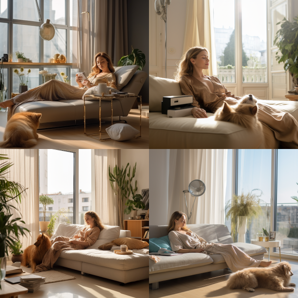 Midjourney Bot 更新时间:2023-08-31 11:10On the 100 square meter sofa in the luxurious living room, there is a beautiful woman sleeping on the reading floor with a golden dog and a window. There is an air purifier on the ground --ar 1:1 --style raw --v 5.2