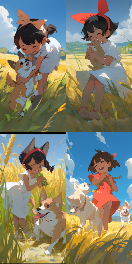 Midjourney Bot 更新时间:2023-08-31 11:06Little girl, short hair, wearing a berry, baby face, big eyes, small nose, small mouth, green dress, skin, white socks, brown shoes, playing with butterflies, squaring beside a yellow and white dog, the background is a rice field connected together, blue sky, white clouds, panoramic, Miyazaki anime style --s 150 --ar 1:2 --style expressive --niji 5