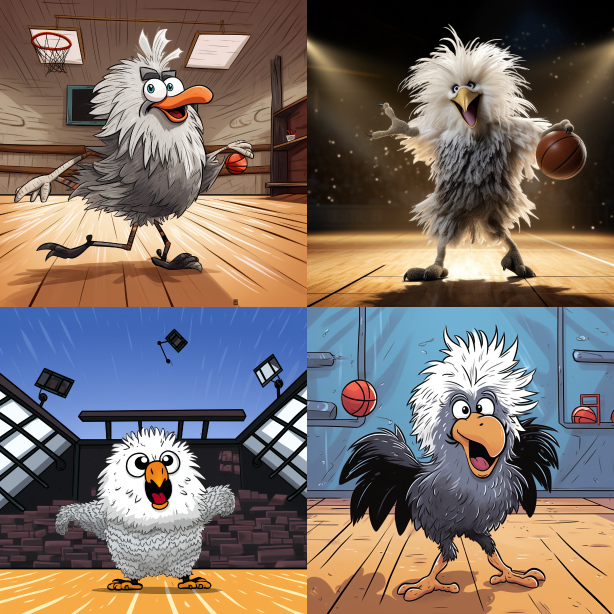 Midjourney Bot 更新时间:2023-08-31 11:17Please output a picture to me based on the following scene: in the picture, a chicken wearing a black top and white suspenders is dribbling on the basketball court. Its silver white split hair soars with movement, showcasing vitality and determination. The basketball court has a standard basketball frame and basketball court lines on the background, creating an atmosphere for the game. The chicken flexibly controls the basketball with its wings, preparing to shoot or pass the ball. --ar 1:1 --style raw --v 5.2
