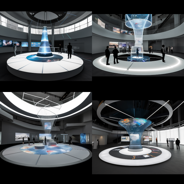 Midjourney Bot 更新时间:2023-08-31 11:12The circular screen in the middle displays a futuristic image, while the ground has a projected map. --ar 1:1 --v 5.2 --style raw