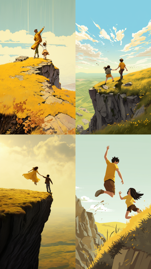 Midjourney Bot 更新时间:2023-08-31 11:11A couple, on a high mountain, surrounded by yellow withered grass. The boy is jumping off the cliff, while the girl is crying on the cliff --ar 9:16 --style raw --v 5.2
