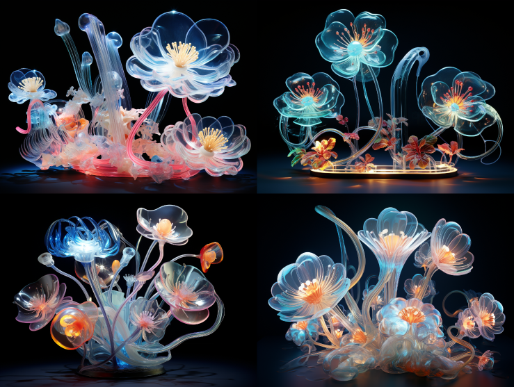 Midjourney Bot 更新时间:2023-08-31 11:16Futuristic flora with roots made of longorganic forms, similar to rooms, plants and anatomy. It has crystal plexiglass oments made of flowers shells leaves and fruits Some parts of it areuminous futuristic inorganic flower, digital flower. class metal, neon sign, transparent plastic, optical composite, light fluorescence, bright. typedetail, transparent metal flower on whiteoackground, C4D, blender. octane rendering,Enhance, studio lighting, using pure white,Background --ar 4:3 --style raw --v 5.2