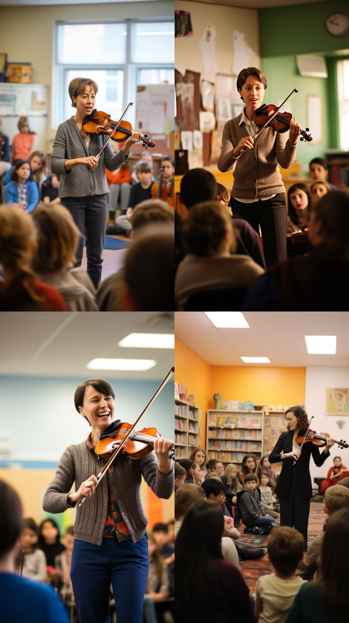 Midjourney Bot 更新时间:2023-08-31 11:08Describing a Roberta violin teacher in the classroom, performing the violin to students, with upper body, background blurry, eyes bright and vivid, facing the audience squarely (mouth closed), film tones, and surreal details --ar 9:16 --style raw --v 5.2