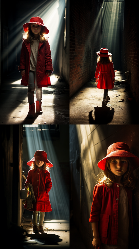 Midjourney Bot 更新时间:2023-08-31 11:07On a sunny afternoon, a little girl, wearing a red hat and lowering her head, was in a dark alley where a beam of sunlight hit her --ar 9:16 --style raw --v 5.2