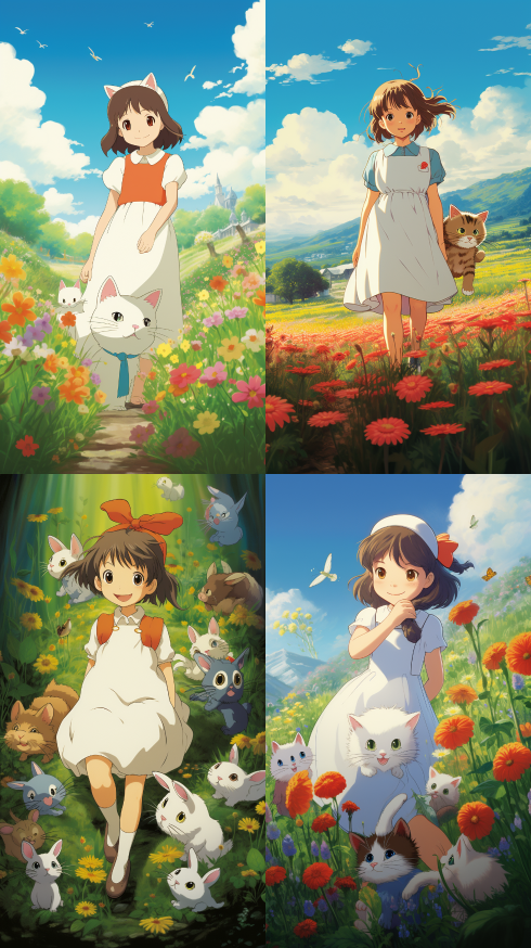 Midjourney Bot 更新时间:2023-08-31 11:15Lively girl, a cut rabbit, cat on, warm tones, groundback of village, characters in Hayao Miyazaki's films --ar 9:16 --style raw --v 5.2