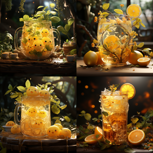 Midjourney Bot 更新时间:2023-08-31 11:14A long transparent cup is filled with lemon and coffee colored liquid, surrounded by lemons, characterized by a surreal fantasy style, charming character illustrations, Vray rendering, rich and immersive nature, and excellent atmosphere. --ar 1:1 --style raw --v 5.2 --s 750