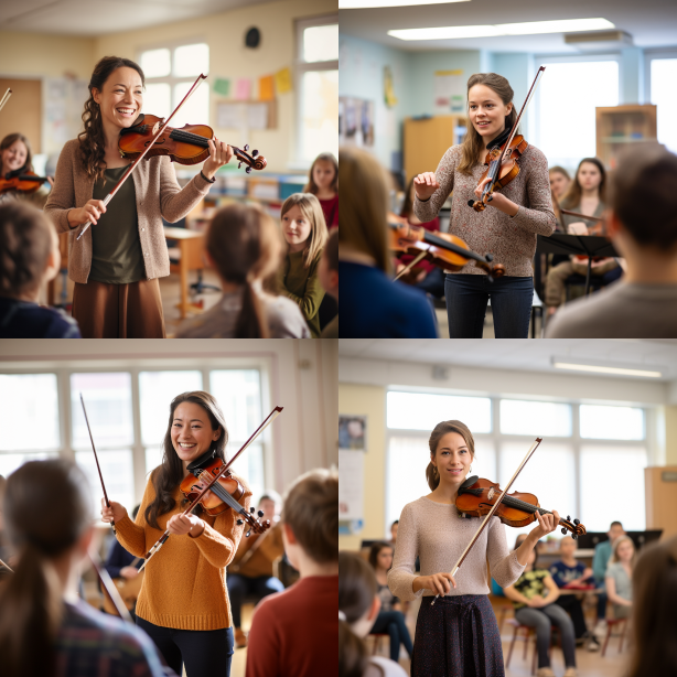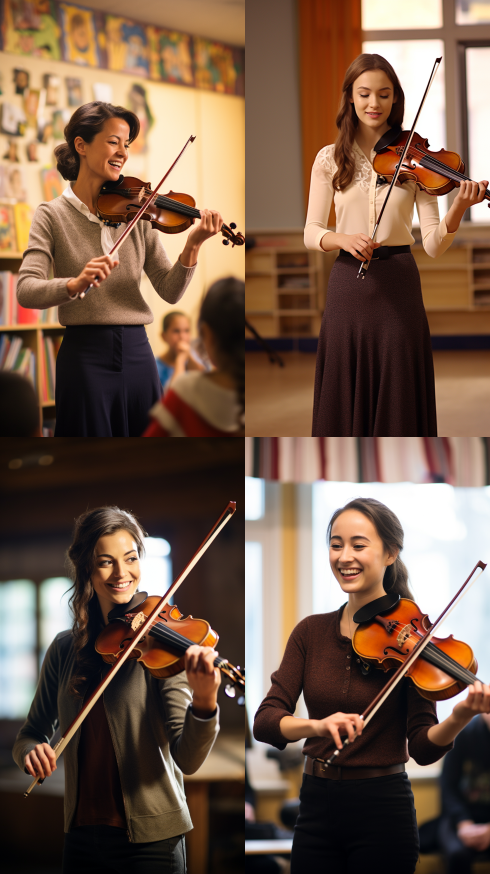 Midjourney Bot 更新时间:2023-08-31 11:03Describing a Roberta violin teacher in the classroom, performing the violin to students, with upper body, background blurry, eyes bright and vivid, facing the audience squarely, mouth closed, movie tone, and ultra realistic details --ar 9:16 --style raw --v 5.2