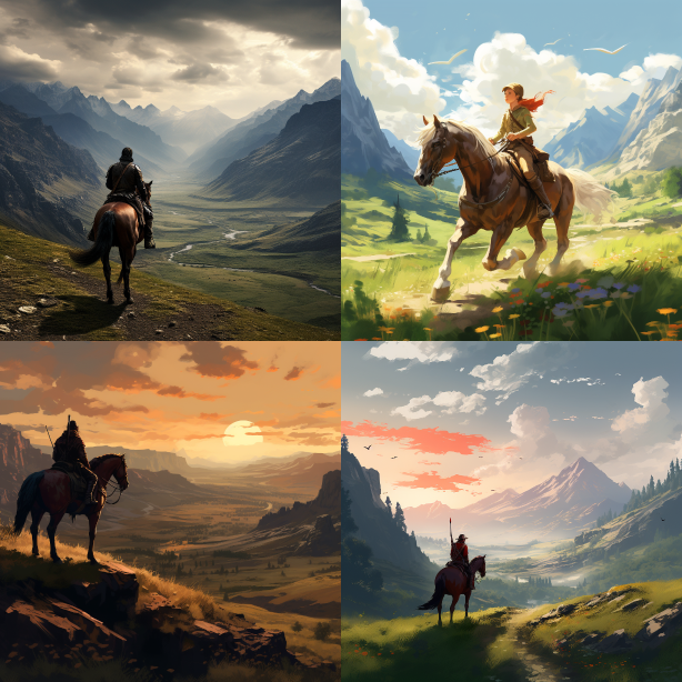 Midjourney Bot 更新时间:2023-08-31 10:55From the profile, I saw the character riding a horse and pressing into the valley --ar 1:1 --style raw --v 5.2