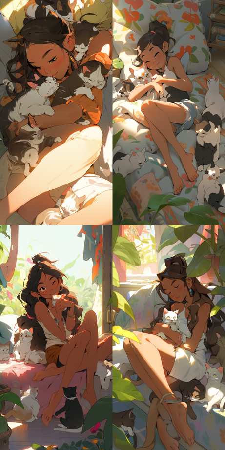 Midjourney Bot 更新时间:2023-08-31 11:00The sunlight sprinkled on the bed, awakening the girl and kitten, making them feel warm and comfortable. Girls like to sit by the window holding their kittens, watching the scenery outside, and enjoying peaceful and beautiful times. This is the life that many people aspire to, filled with love, comfort, and beautiful memories. --s 250 --ar 1:2 --style expressive --niji 5