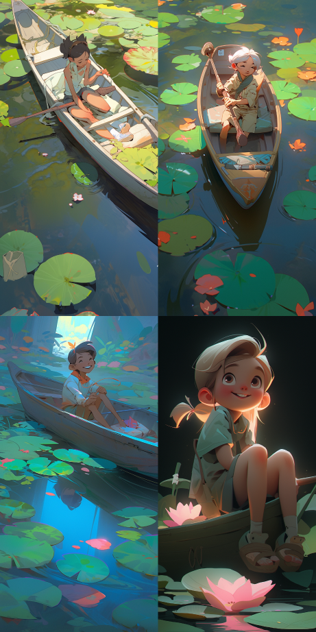 Midjourney Bot 更新时间:2023-08-31 11:03Little girl, smiling, sitting on a boat, pond, lotus, bubbles, bright summer colors, sparks, blooming, cartoon style, 3D art, depth of field, saturated color scheme, intricate details, animated lights, ray tracing, super high quality, Ultra HD 8K, blank flat illustration on top of frame, flat illustration --s 250 --ar 1:2 --style expressive --niji 5