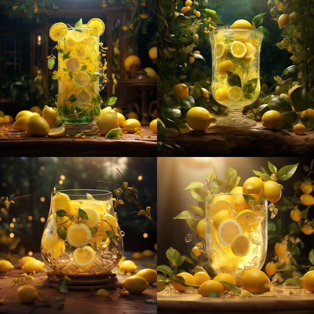 Midjourney Bot 更新时间:2023-08-31 11:03A long transparent cup filled with lemons, surrounded by lemons, features a surreal fantasy style, captivating character illustrations, Vray rendering, rich and immersive nature, and excellent atmosphere. --ar 1:1 --style raw --v 5.2