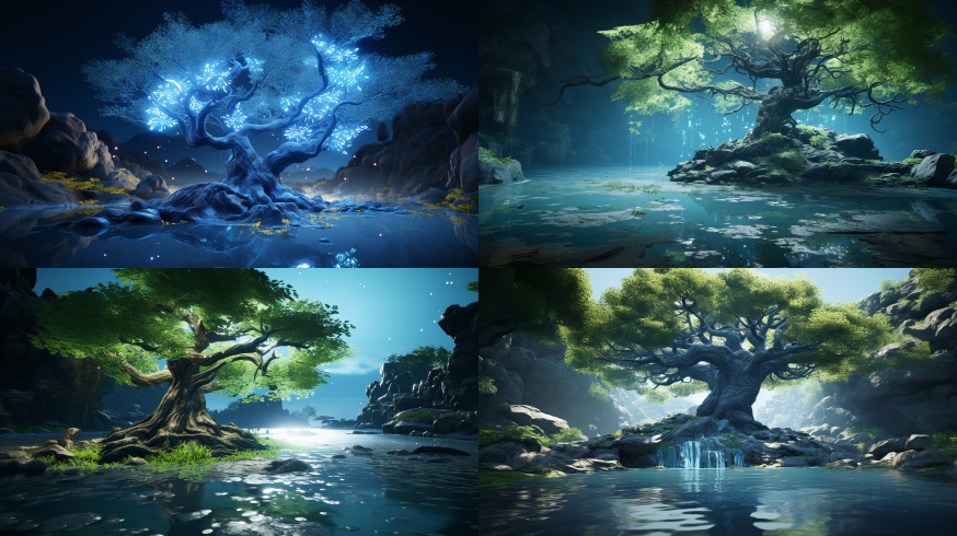 Midjourney Bot 更新时间:2023-08-31 11:03A large tree with curved blue leaves, growing in a blue green glowing waterhole,unreal engine 5::2,high resolution,16K,ultra-detailed --ar 16:9 --style raw --v 5.2
