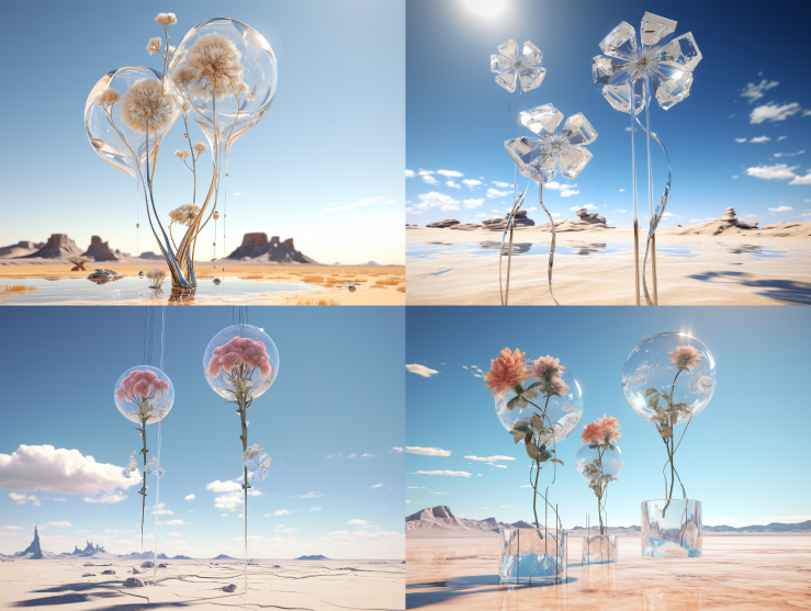 Midjourney Bot 更新时间:2023-08-31 11:00Future feeding, make of crystal, growing rewards, 2 flowers, metal, high quality, sky, clean, desert, upside-down composition, UHD,upside-down Composition,UHD,clean background,surrealism --ar 4:3 --style raw --v 5.2