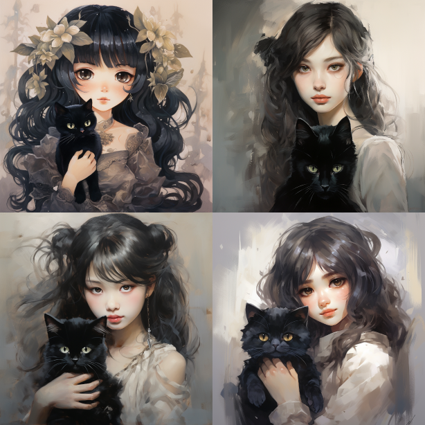 Midjourney Bot 更新时间:2023-08-31 10:56A painting in the style of Marcoto Shin Haicheng, depicting a scene of an anime girl holding a cat. The painting features light black and black as the main tones, incorporating elements of Marano art. The girl has sparkling eyes and a soft and romantic background. The painting style is similar to the cartoon scenes of Sliman Mansour, with an atmosphere of 1970s animation. The girl has long black hair and is wearing cat ears. She looks straight at the audience, with clear details and a resolution of 4K. --ar 1:1 --style raw --v 5.2