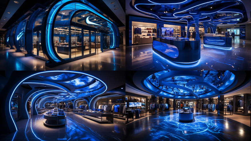 Midjourney Bot 更新时间:2023-08-31 09:39A Huge high tech sport store made of blue skin,Walls modern nike store in the form shopping mall, Metal tube garment frame, main DP island design, front shoe wall, LED illuminated light bar, ceiling for LED strip light,,Interior design 8k,high resolution,16K,cinematic style,Yohji Yamamoto --s 774 --c 72 --ar 16:9 --style raw --v 5.2