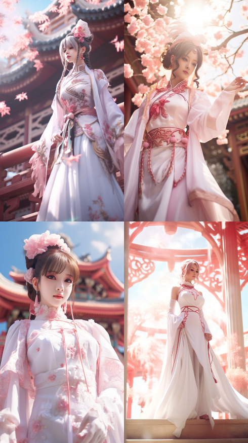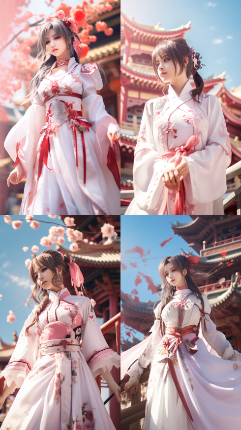 Midjourney Bot 更新时间:2023-08-31 09:40A Chinese woman dressed in complex white and pink clothes, with Chinese architecture, high-definition image quality, super details, soft light, cosplay, bright sunshine, light and shadow effects, cinematic image quality, smile, anime --ar 9:16 --style raw --v 5.2
