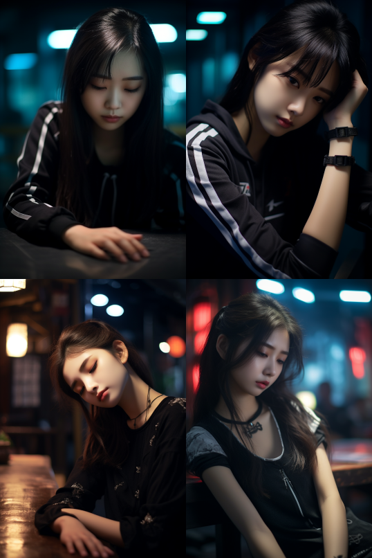 Midjourney Bot 更新时间:2023-08-31 09:40A girl with an arm and a black top posting with her head down, in the style of chinapunk, 32k uhd, soft and dreamy atmosphere, webcam photography, exaggeratedfacial features, activating size, fine lines --ar 2:3 --style raw --v 5.2