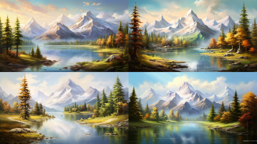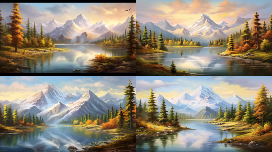 Midjourney Bot 更新时间:2023-08-31 09:43A Majestic mountain with sunlight shining on both sides, surrounded by trees, grass, and lake water, featuring oil painting style, super details, and realistic painting --iw 0.5 --ar 16:9 --style raw --v 5.2