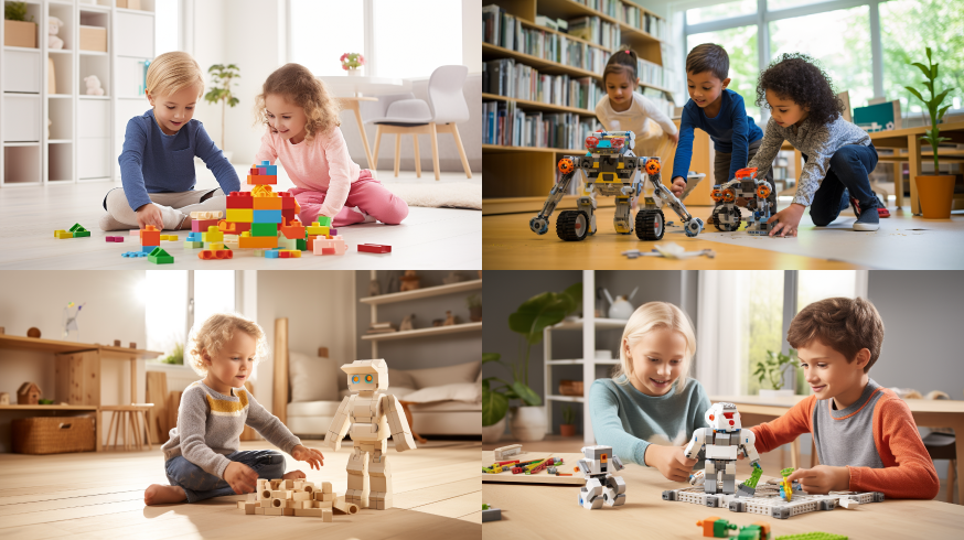 Midjourney Bot 更新时间:2023-08-31 09:45Two robots are building blocks, while two children are playing nearby. --ar 16:9 --style raw --v 5.2