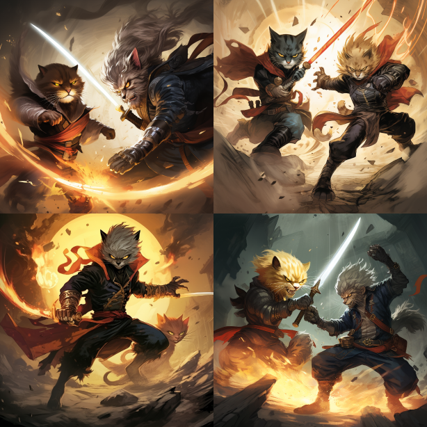 Midjourney Bot 更新时间:2023-08-31 09:39Sun Wukong Battles Black Cat Sheriff --ar 1:1 --style raw --v 5.2