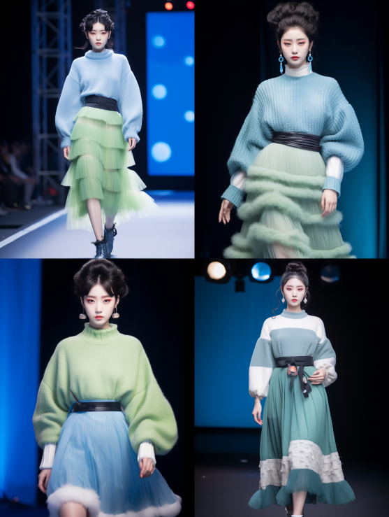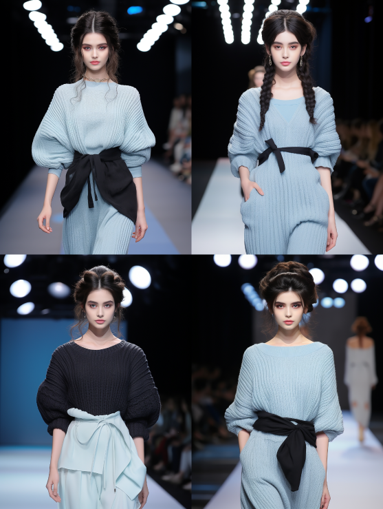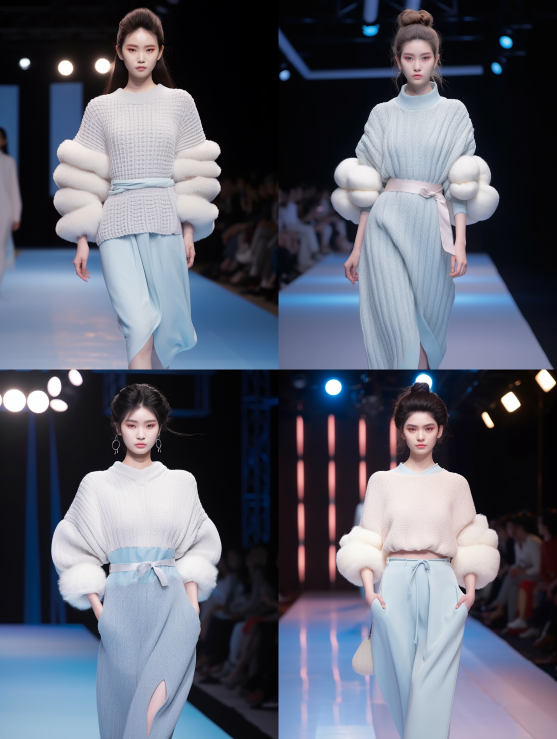 Midjourney Bot 更新时间:2023-08-31 09:15Chinese style, Korean girl, runway, exquisite facial features, big eyes, wearing a knitted sweater, bubble sleeves, weaving, skirt stitching fur, background runway show, full body photo,full lipsheavy bright makeupnatural volumetric,delicate skin texture,Best quality,UHD,hairpin,hair bun --ar 3:4 --style raw --v 5.2