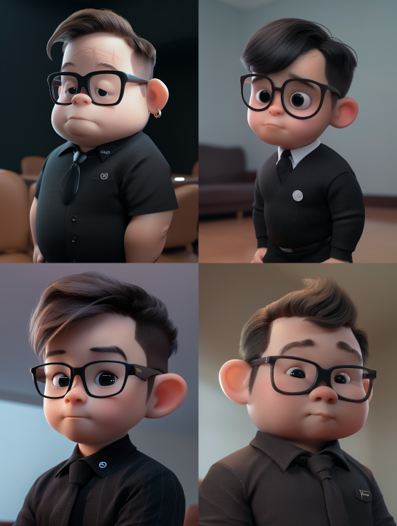 Midjourney Bot 更新时间:2023-08-31 09:22The photography work of Disney Pixar Studio, dressed in a dark suit, Disney style boy, round face, cute chubby boy, white background, big eyes, wearing glasses, no wrinkles, Pixar level super details, clay texture, reflective transparent rainbow color, soft past tones, model display, delicate gloss, clean background, 3D rendering, soft focus, processed using software such as Octane and Blender, Best Picture Quality --iw 0.5 --ar 3:4 --style expressive --niji 5