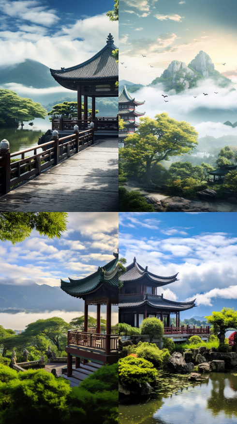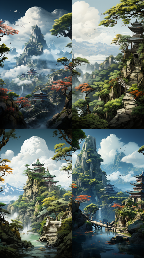 Midjourney Bot 更新时间:2023-08-31 09:22The ancient style pavilion is filled with white clouds in the sky, surrounded by tea trees. The distant mountains are like shadows, and egrets fly on the mountains, resembling a fairyland. The clarity is 4K, the color is more eye-catching, and the resolution is 300 --ar 9:16 --style raw --v 5.2