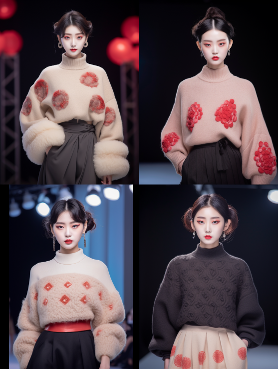 Midjourney Bot 更新时间:2023-08-31 09:10Chinese style, Korean girl, exquisite facial features, big eyes, wearing a knitted sweater, bubble sleeves, weaving, hem stitching fur, background runway show,,full lipsheavy bright makeupnatural volumetric,delicate skin texture,Best quality,UHD,hair flower,black hair,hair bun --s 26 --ar 3:4 --style raw --v 5.2